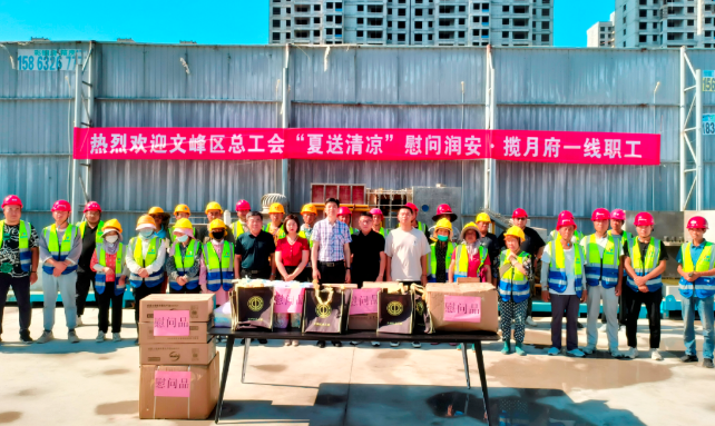 為做好防暑降溫工作,切實(shí)保障一線職工的健康安全。6月15日上午,安陽市文峰區(qū)總工會(huì)常務(wù)副主席連繼業(yè)、副主席閆妍一行深入集團(tuán)公司潤安攬?jiān)赂?xiàng)目部開展“夏送清涼”走訪慰問。集團(tuán)公司副董事長李志超、工會(huì)主席王福民、攬?jiān)赂?xiàng)目總經(jīng)理張帆等對工會(huì)領(lǐng)導(dǎo)的到來表示熱烈歡迎。